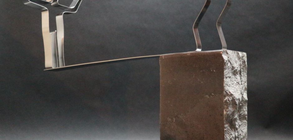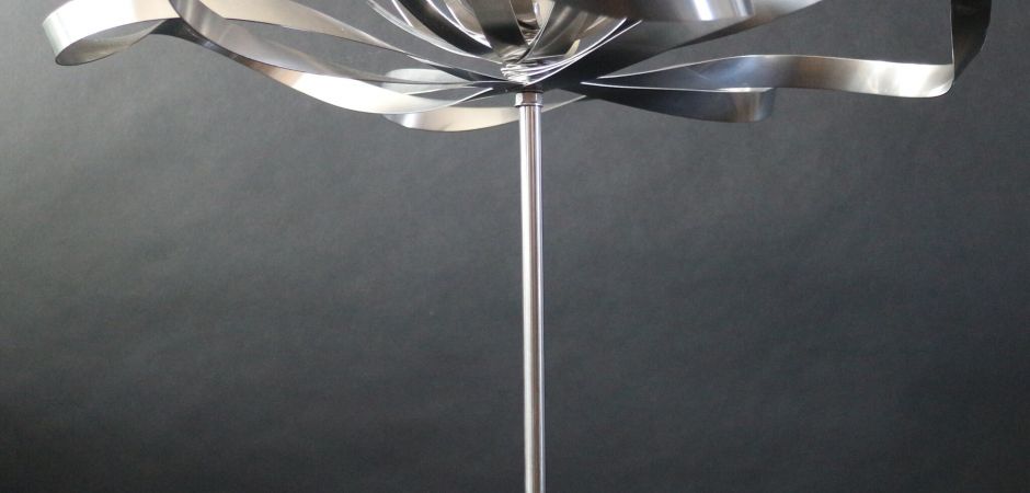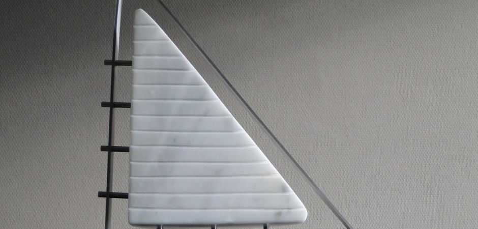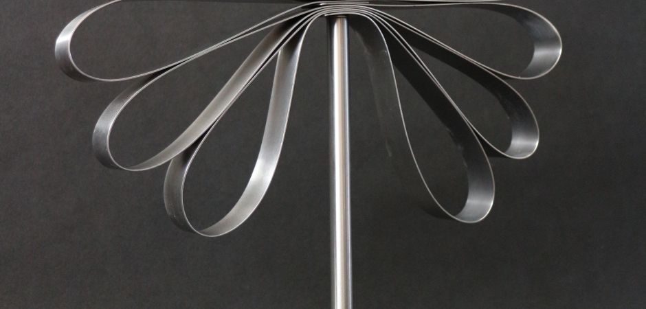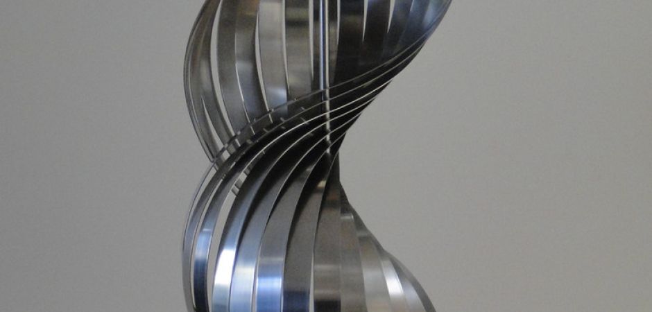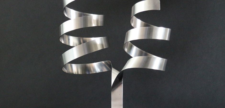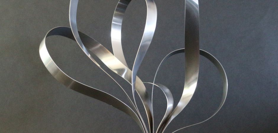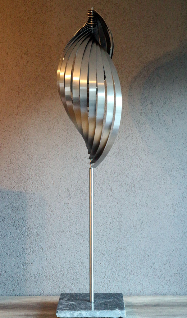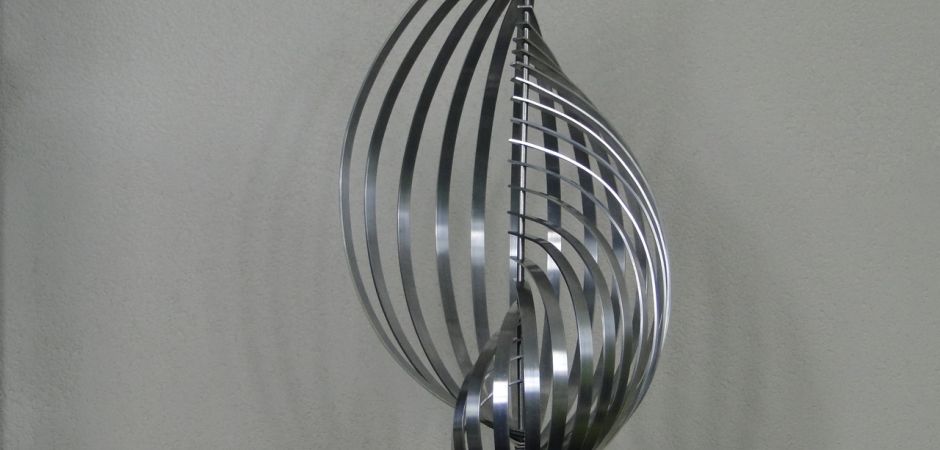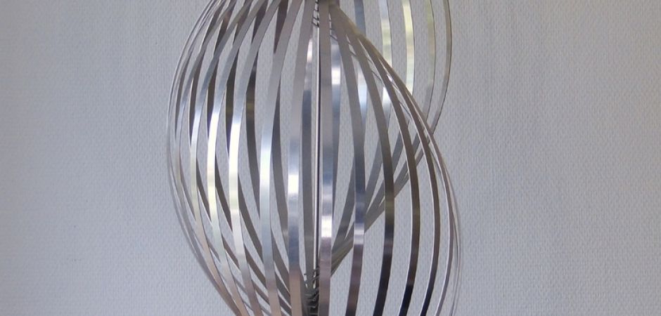 2014-2025Deze sculpturen zijn gemaakt van repen van aluminium of van RVS. In diverse breedten en lengten. De repen zijn gemonteerd aan een RVS stang en geplaatst op een hardstenen sokkel.