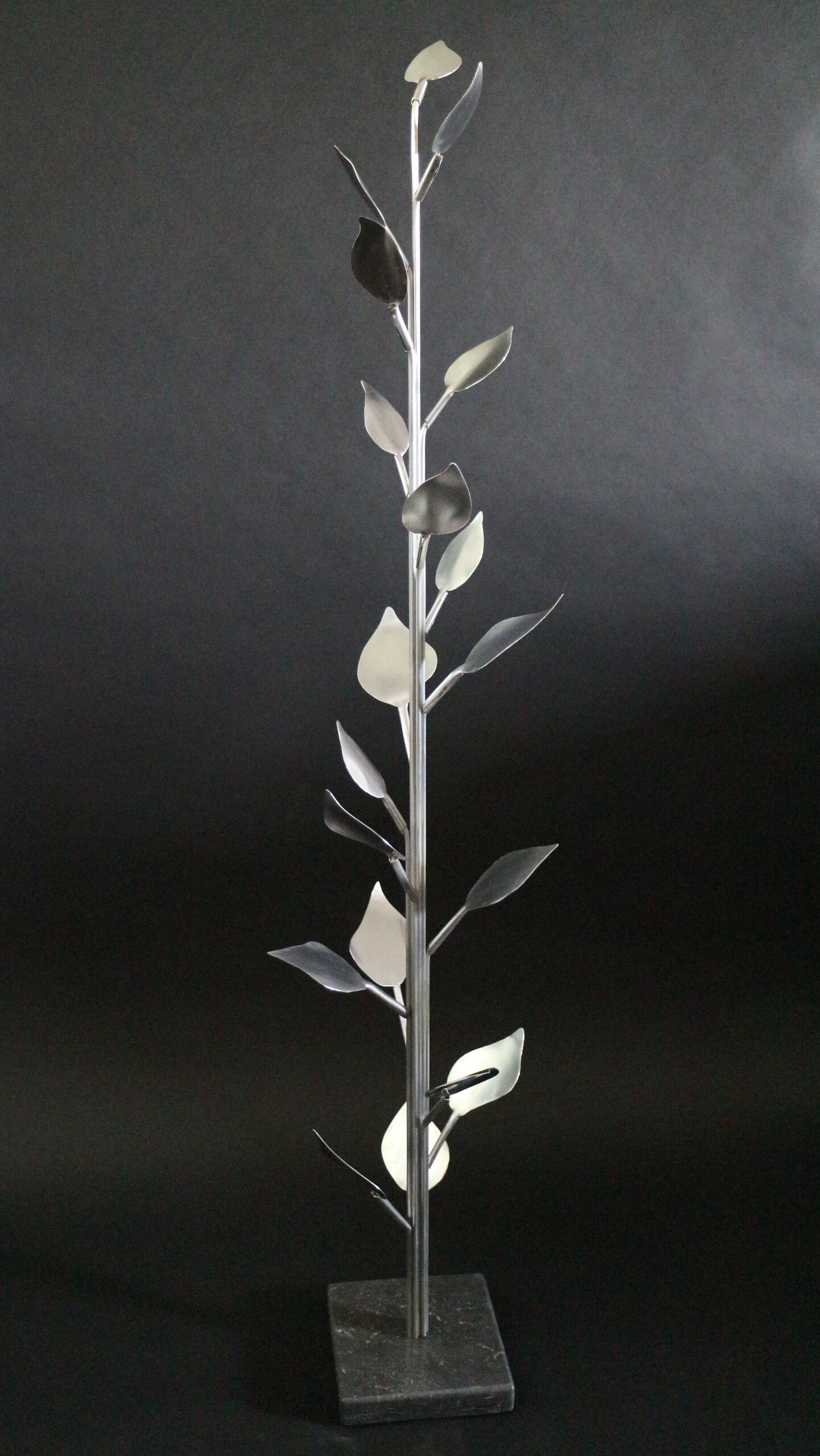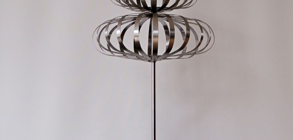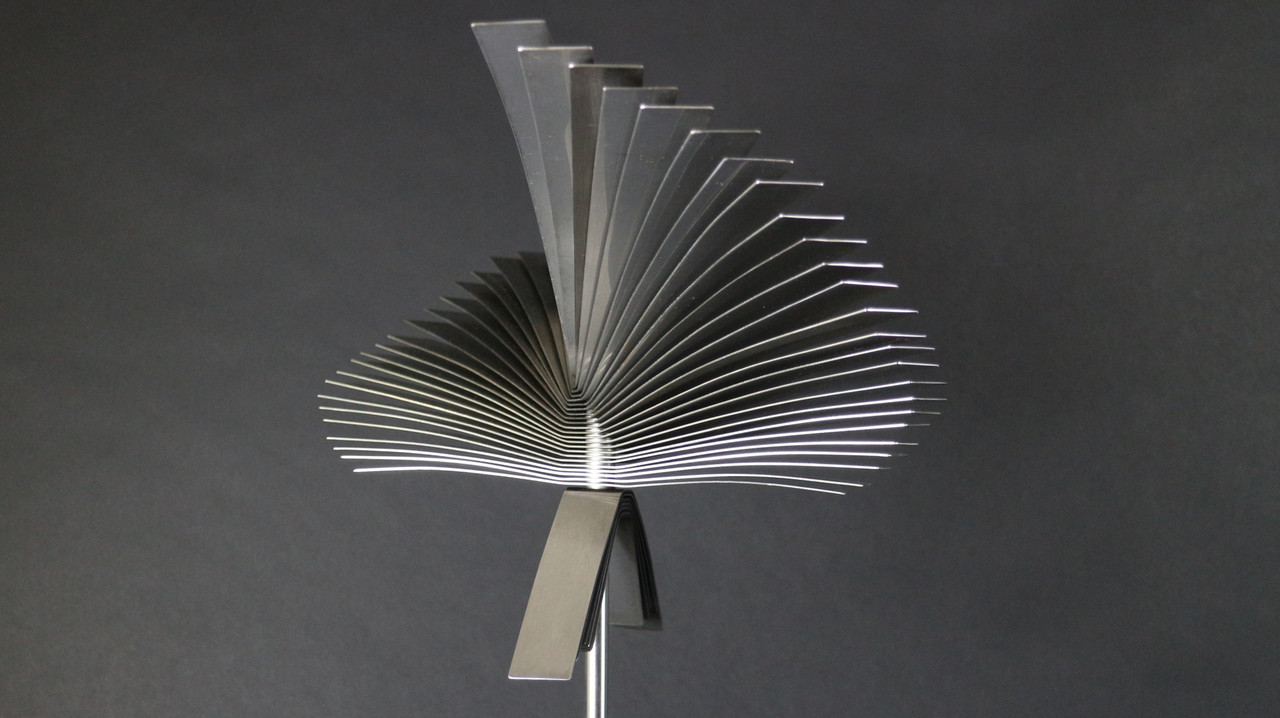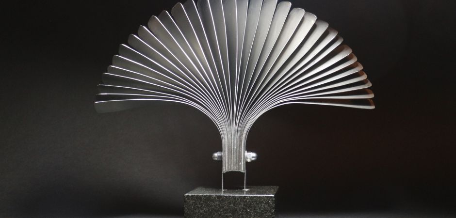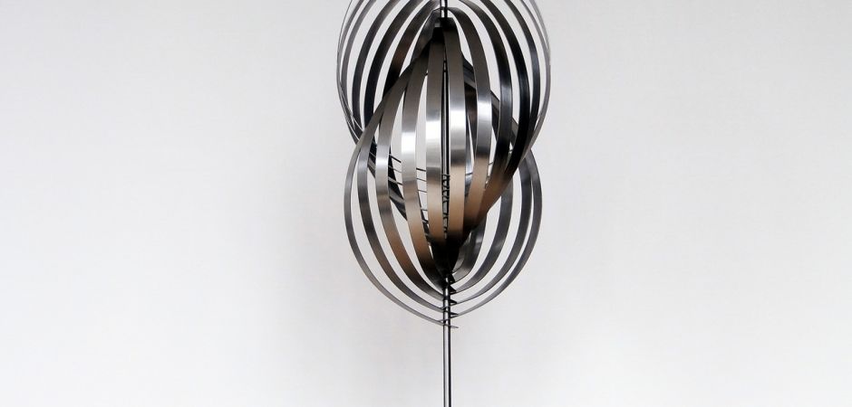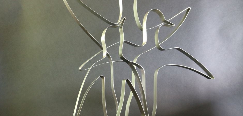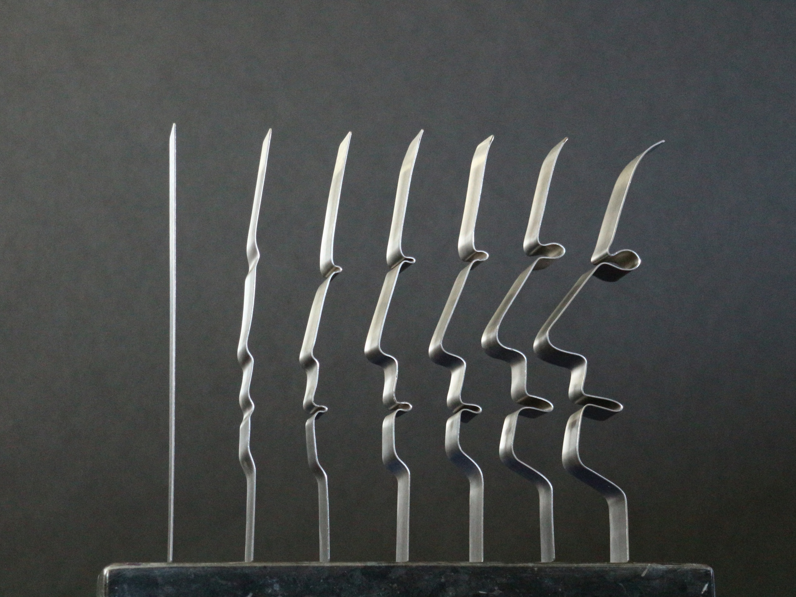 2014-2025Deze sculpturen zijn gemaakt van repen van aluminium of van RVS. In diverse breedten en lengten. De repen zijn gemonteerd aan een RVS stang en geplaatst op een hardstenen sokkel.