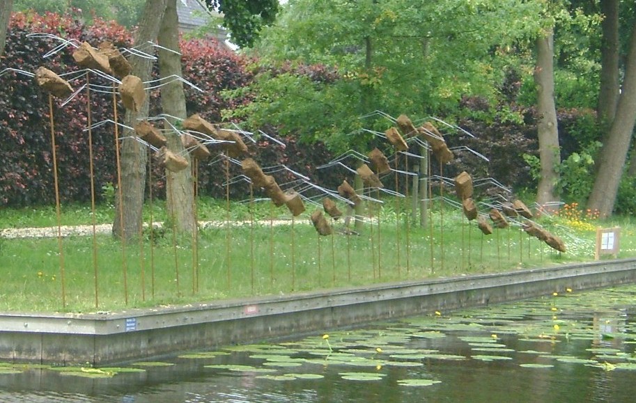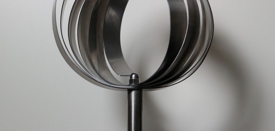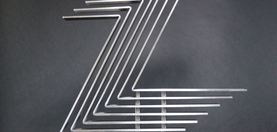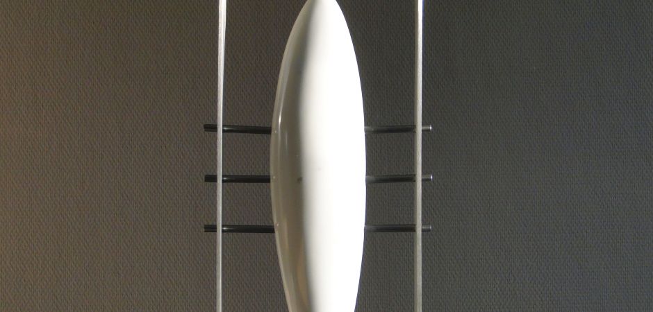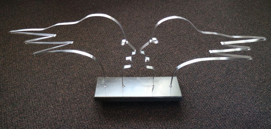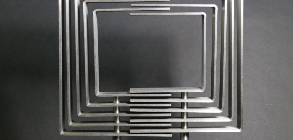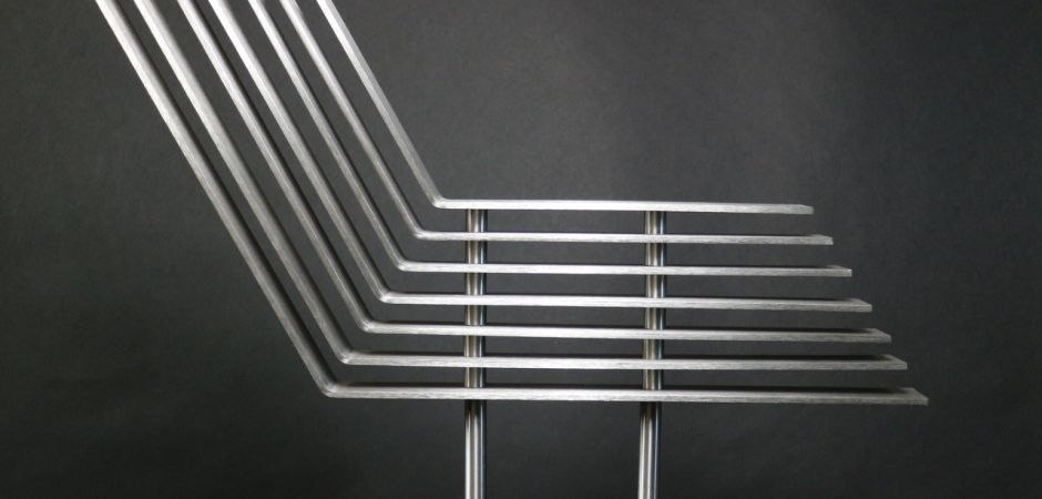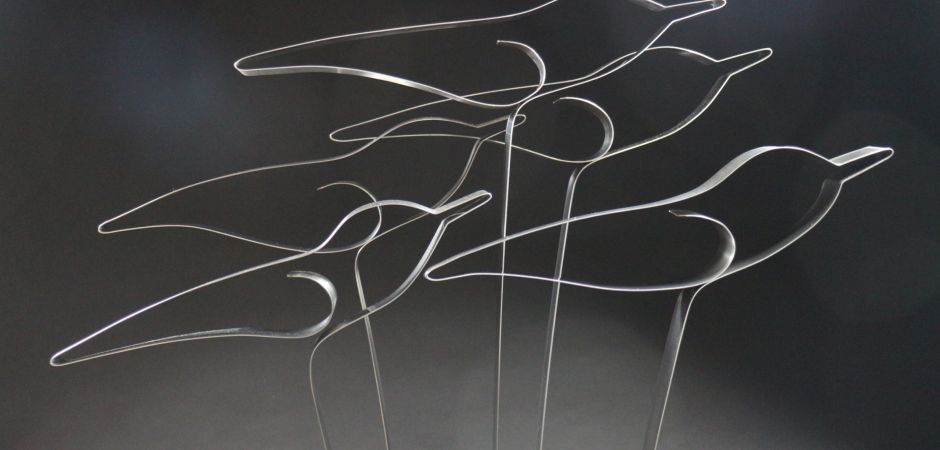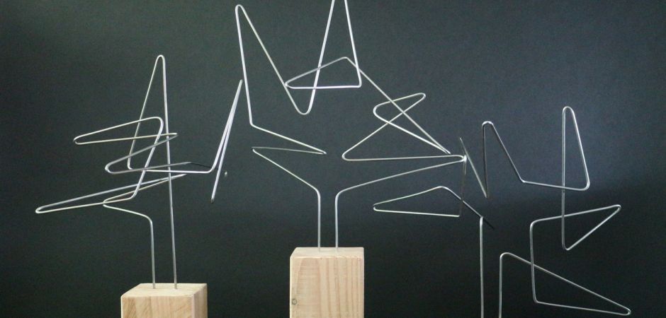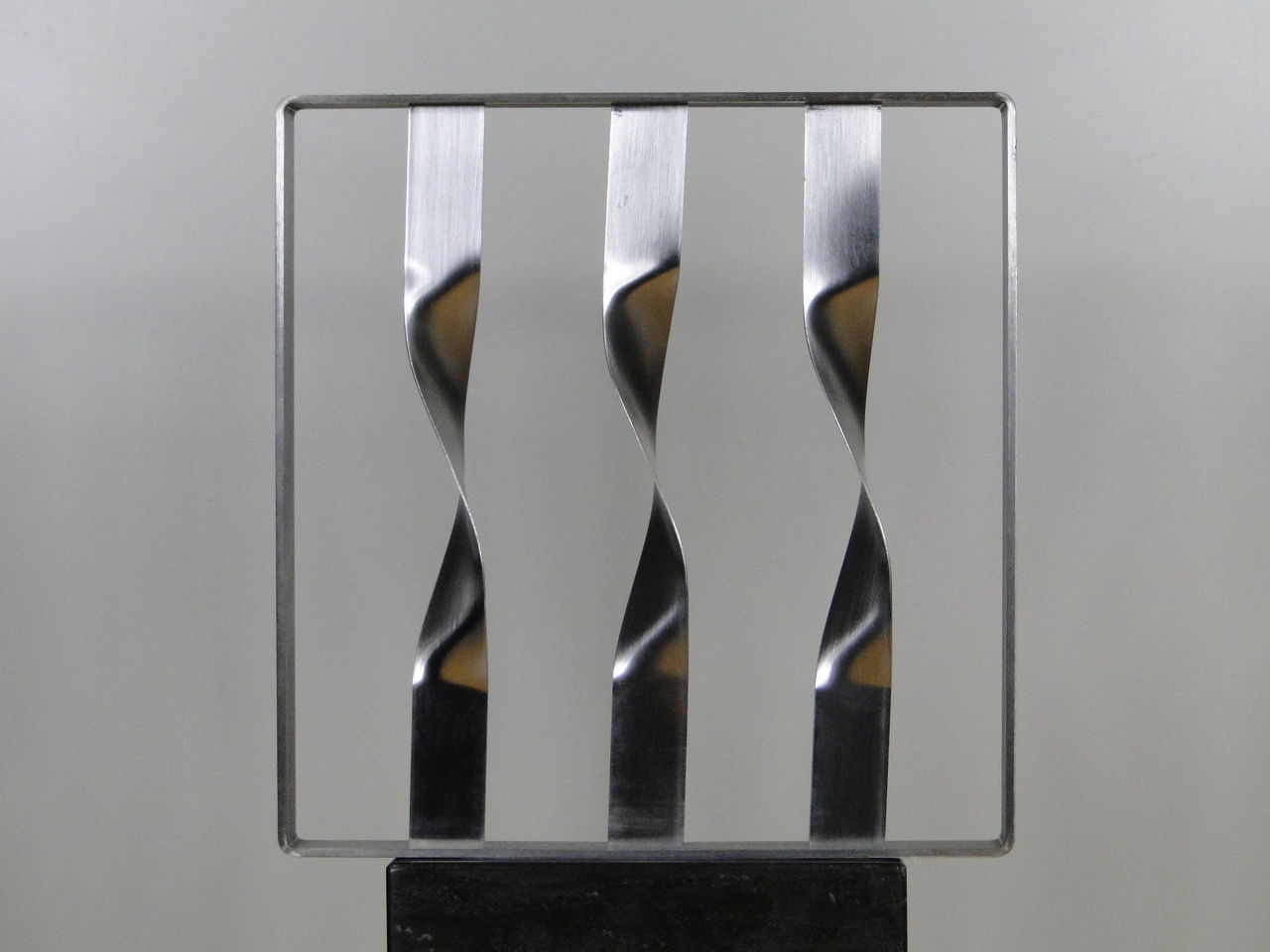 2014-2025Deze sculpturen zijn gemaakt van repen van aluminium of van RVS. In diverse breedten en lengten. De repen zijn gemonteerd aan een RVS stang en geplaatst op een hardstenen sokkel.