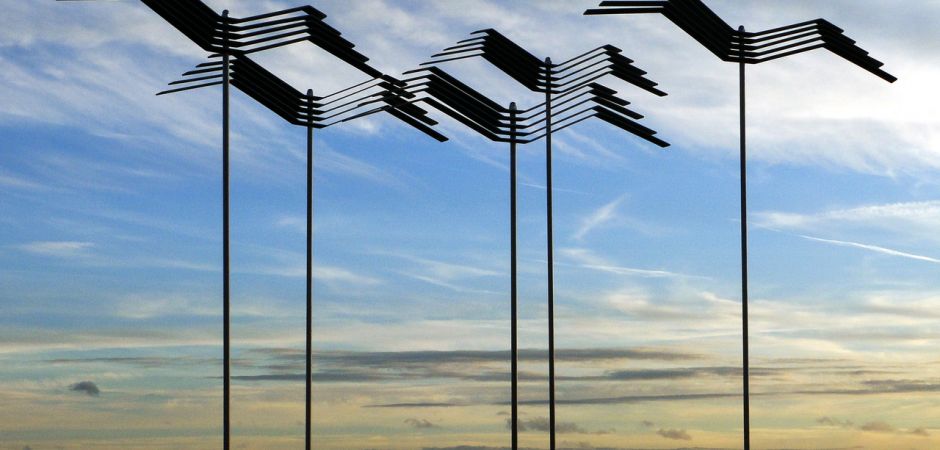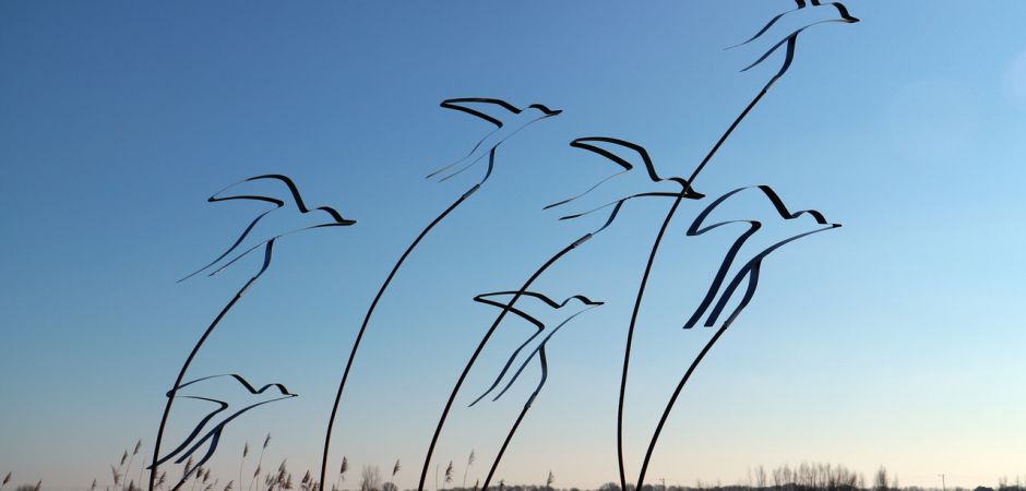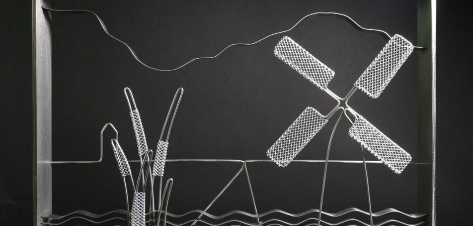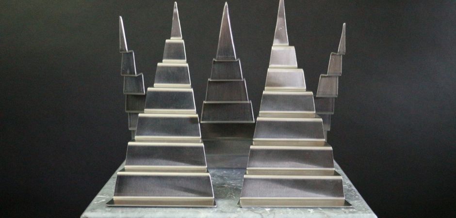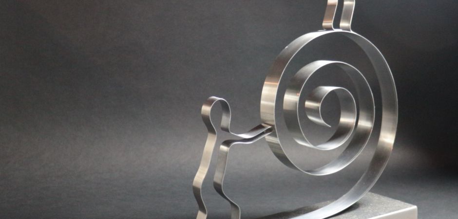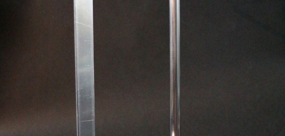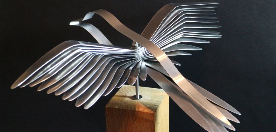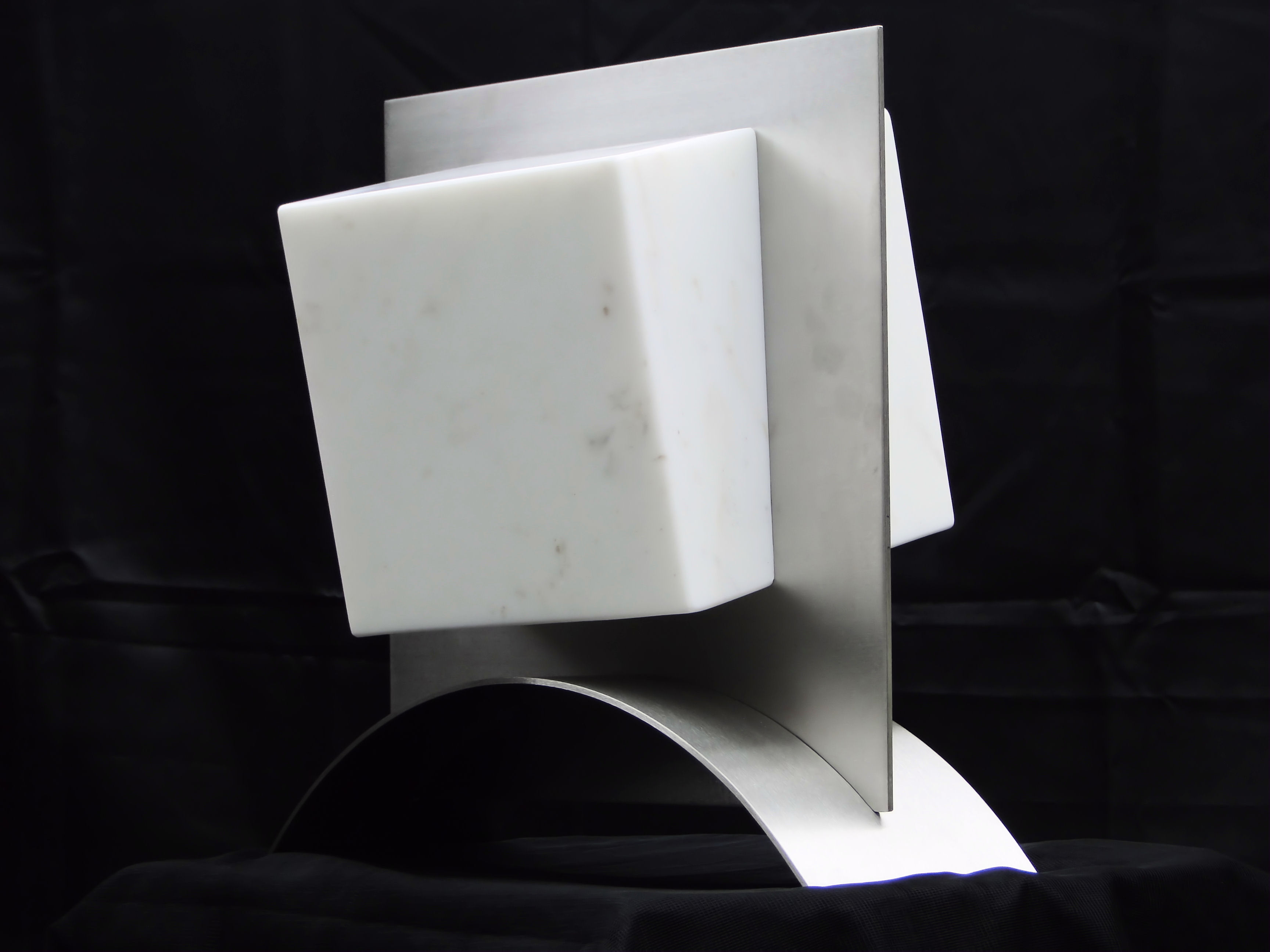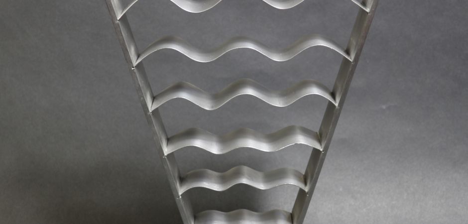 2014-2025Deze sculpturen zijn gemaakt van repen van aluminium of van RVS. In diverse breedten en lengten. De repen zijn gemonteerd aan een RVS stang en geplaatst op een hardstenen sokkel.