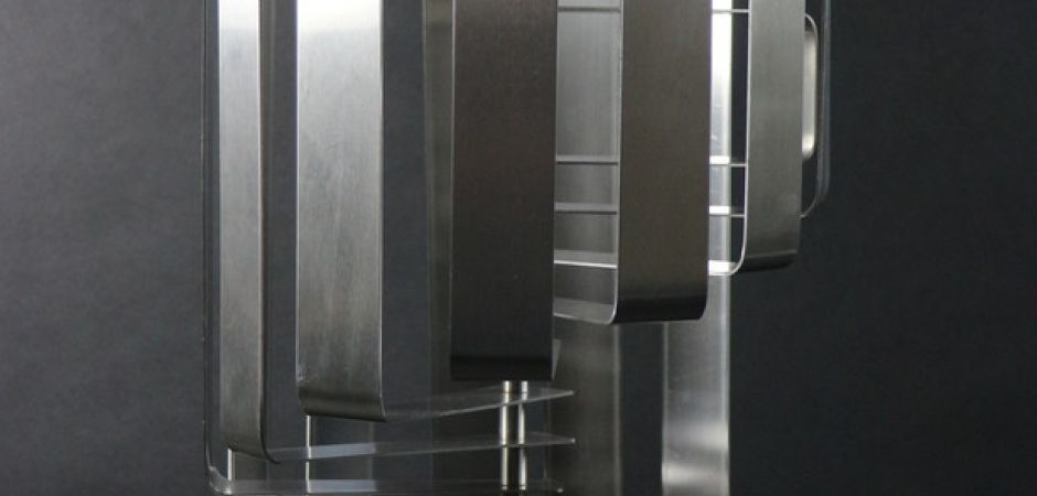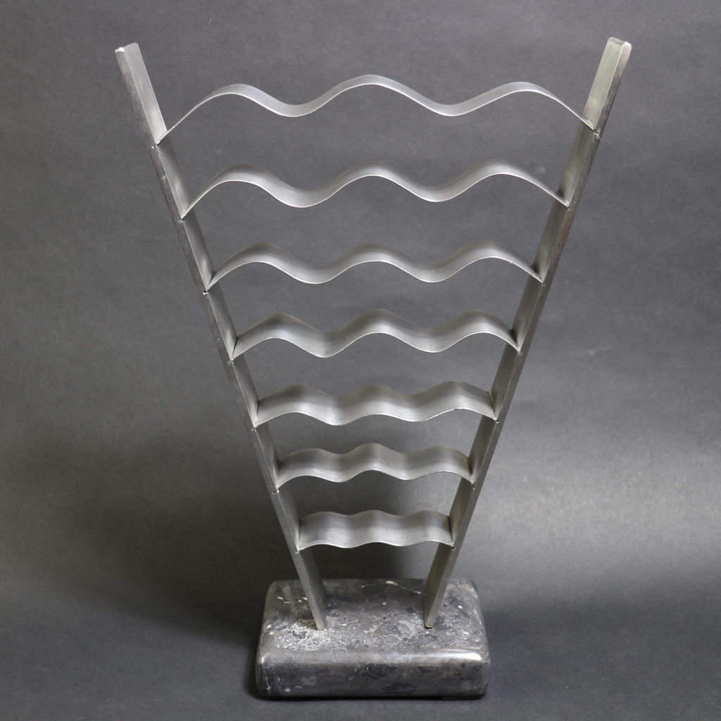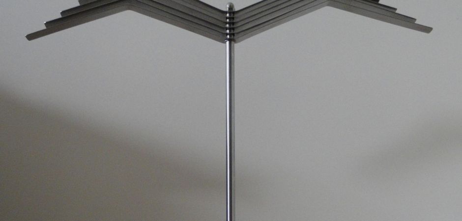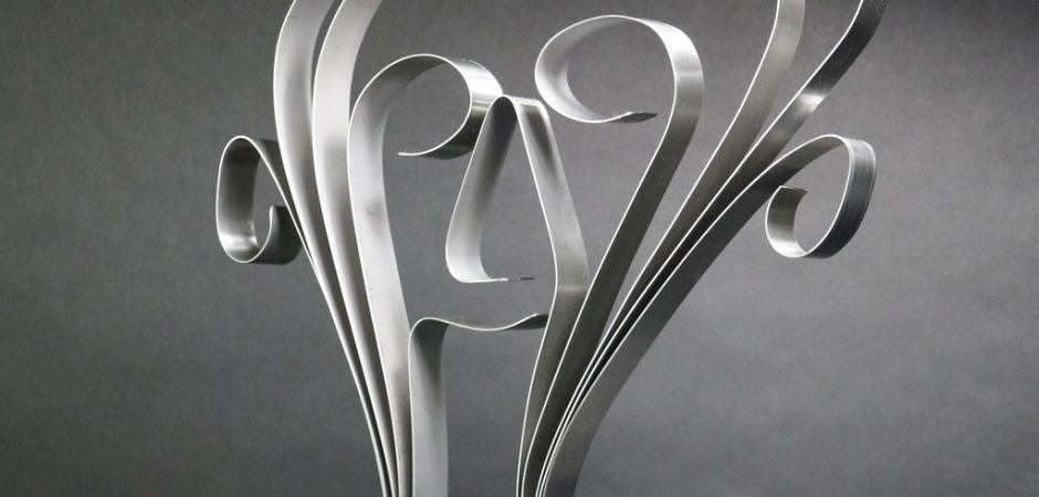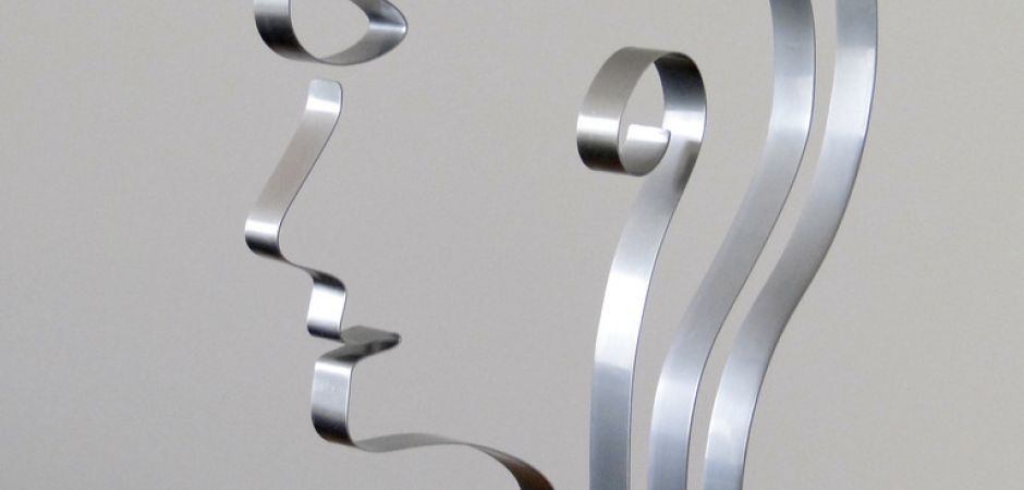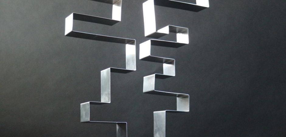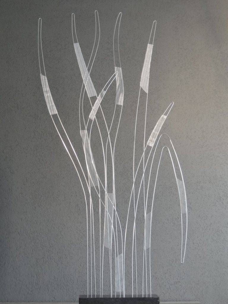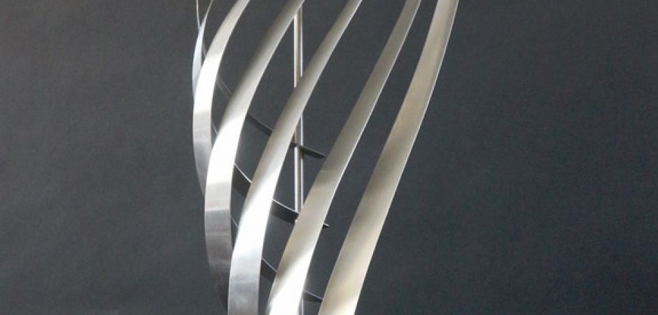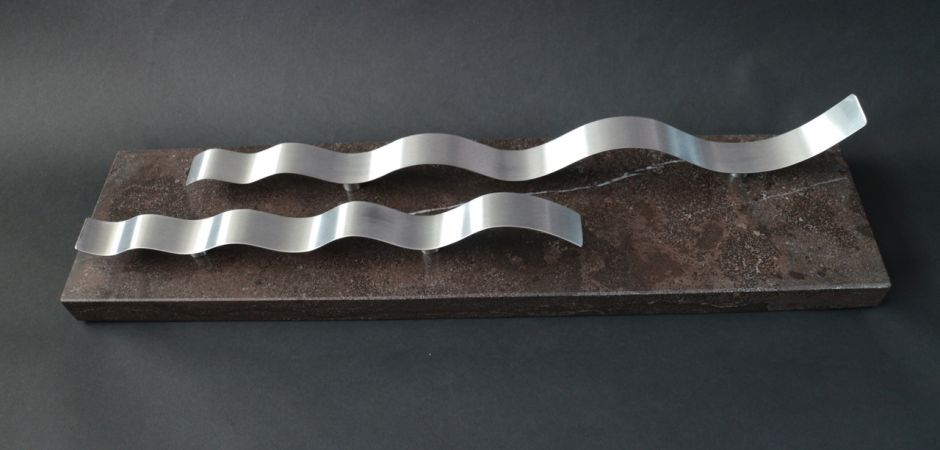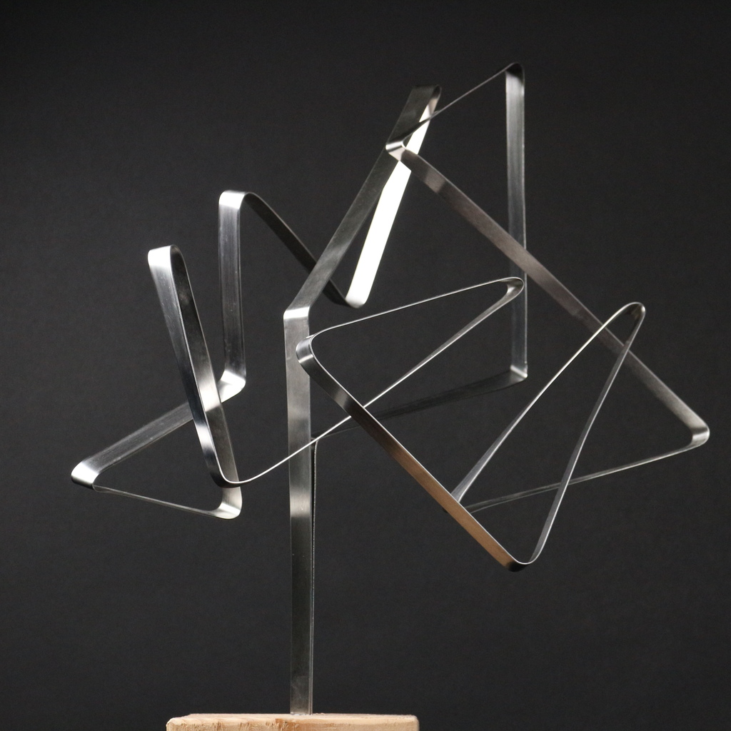 2014-2025Deze sculpturen zijn gemaakt van repen van aluminium of van RVS. In diverse breedten en lengten. De repen zijn gemonteerd aan een RVS stang en geplaatst op een hardstenen sokkel.