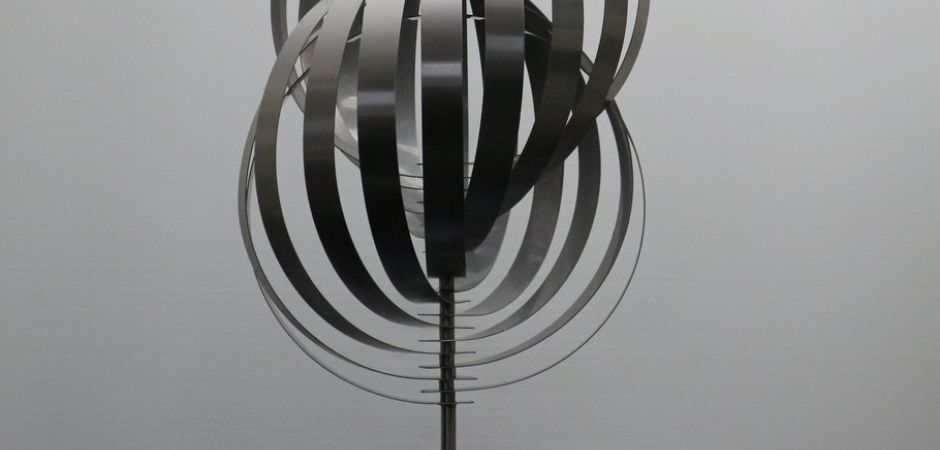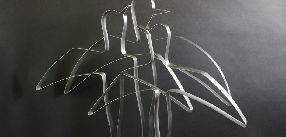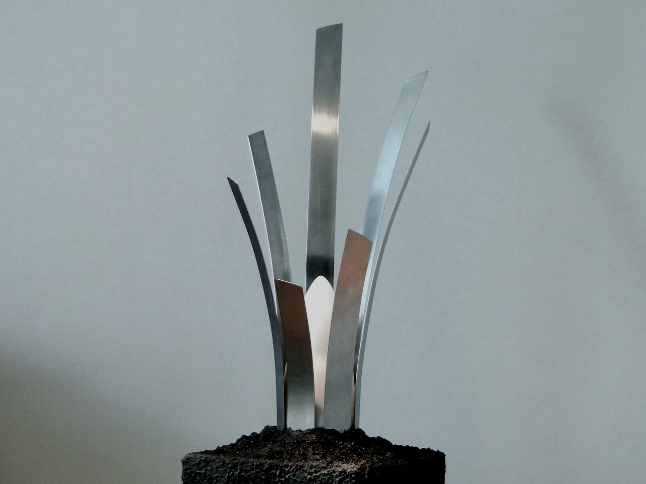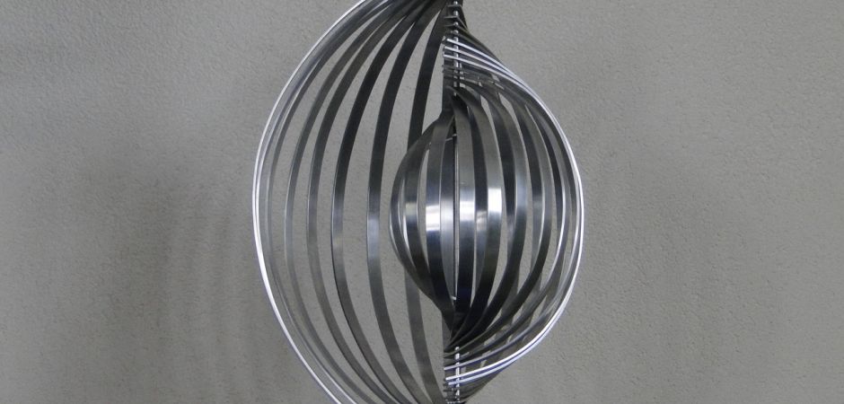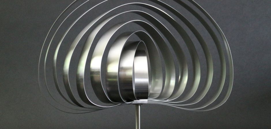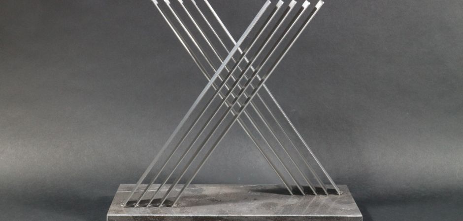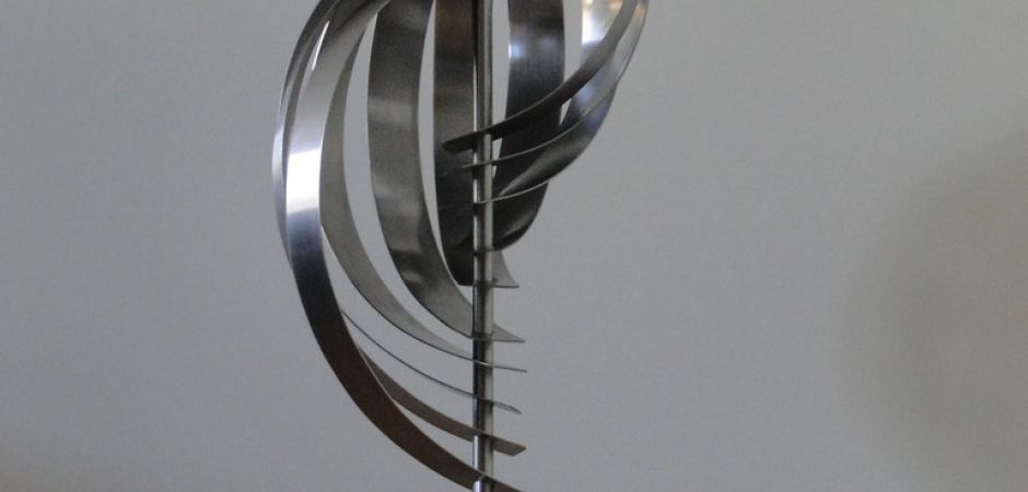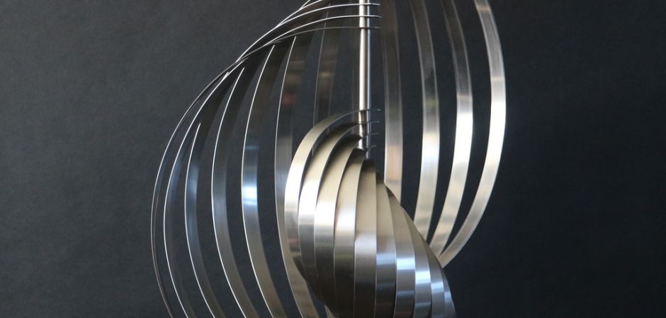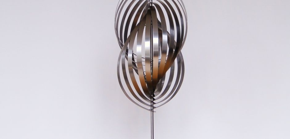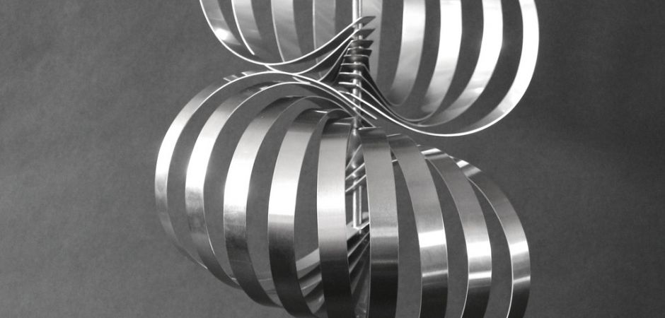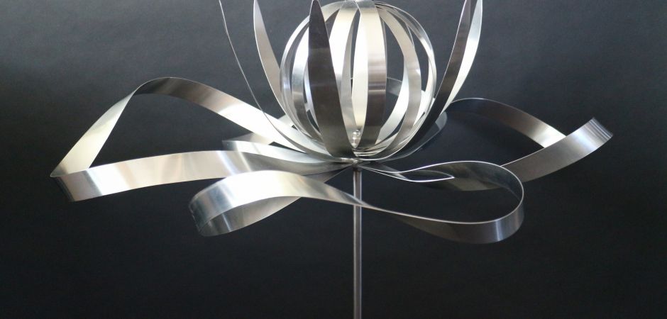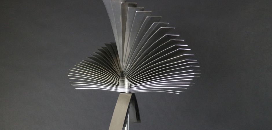 2014-2025Deze sculpturen zijn gemaakt van repen van aluminium of van RVS. In diverse breedten en lengten. De repen zijn gemonteerd aan een RVS stang en geplaatst op een hardstenen sokkel.