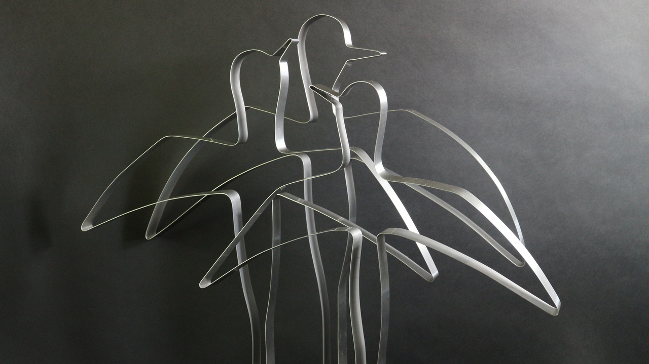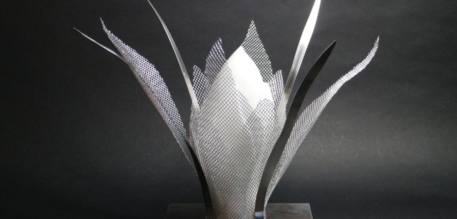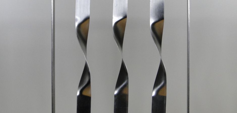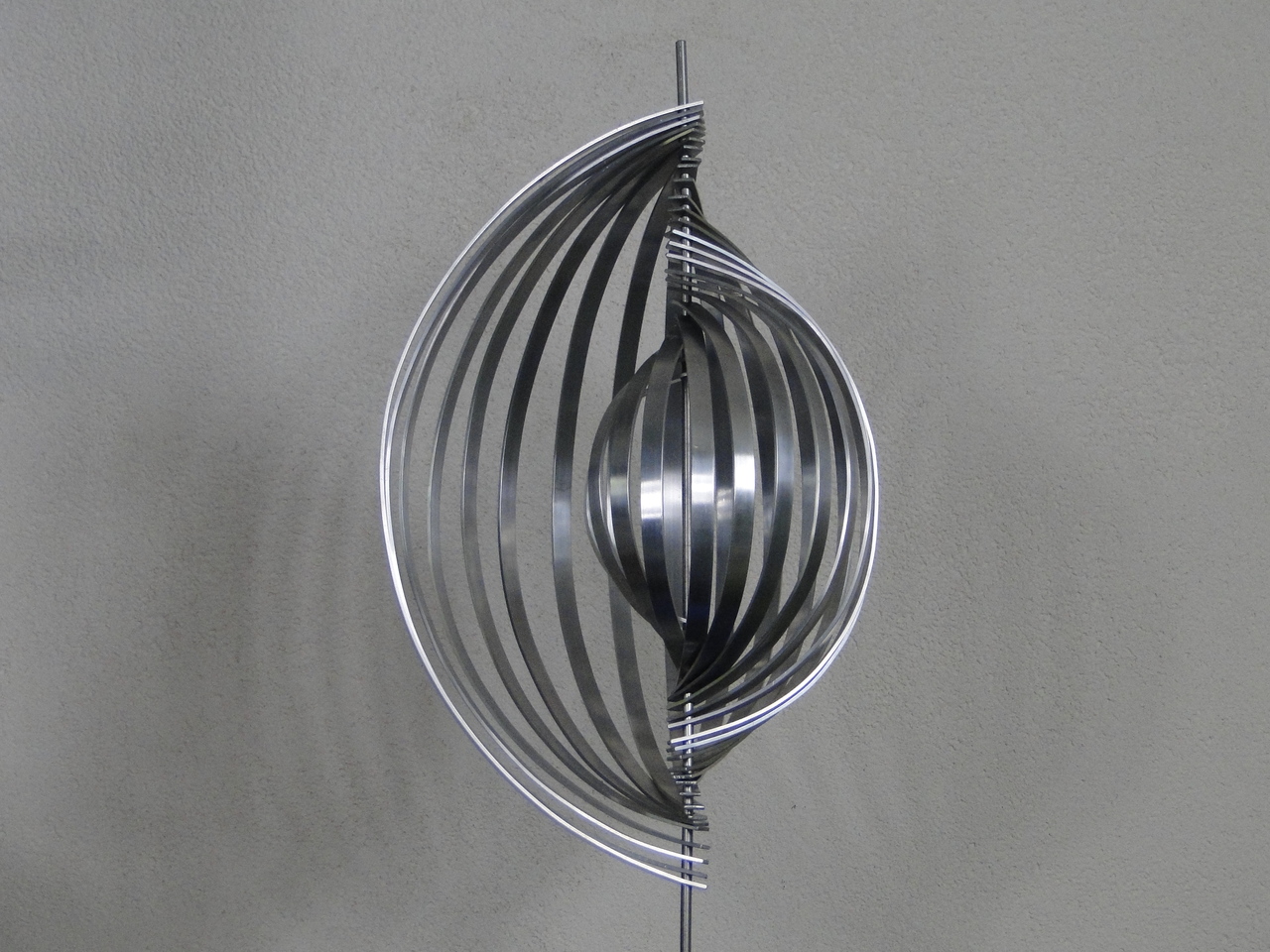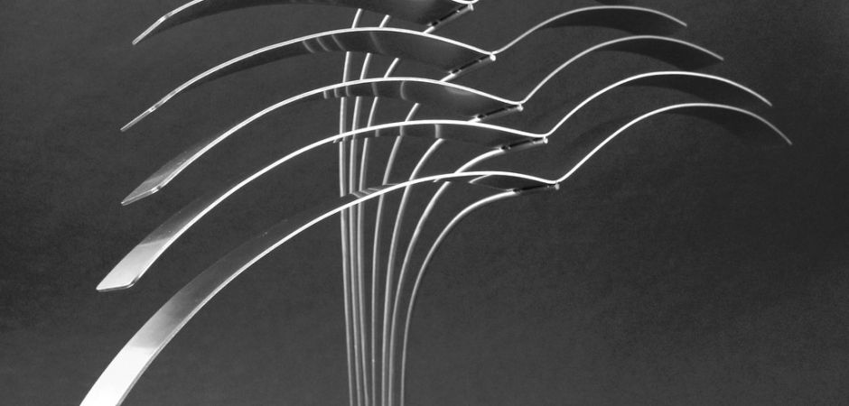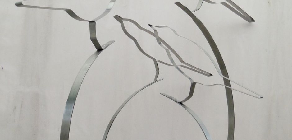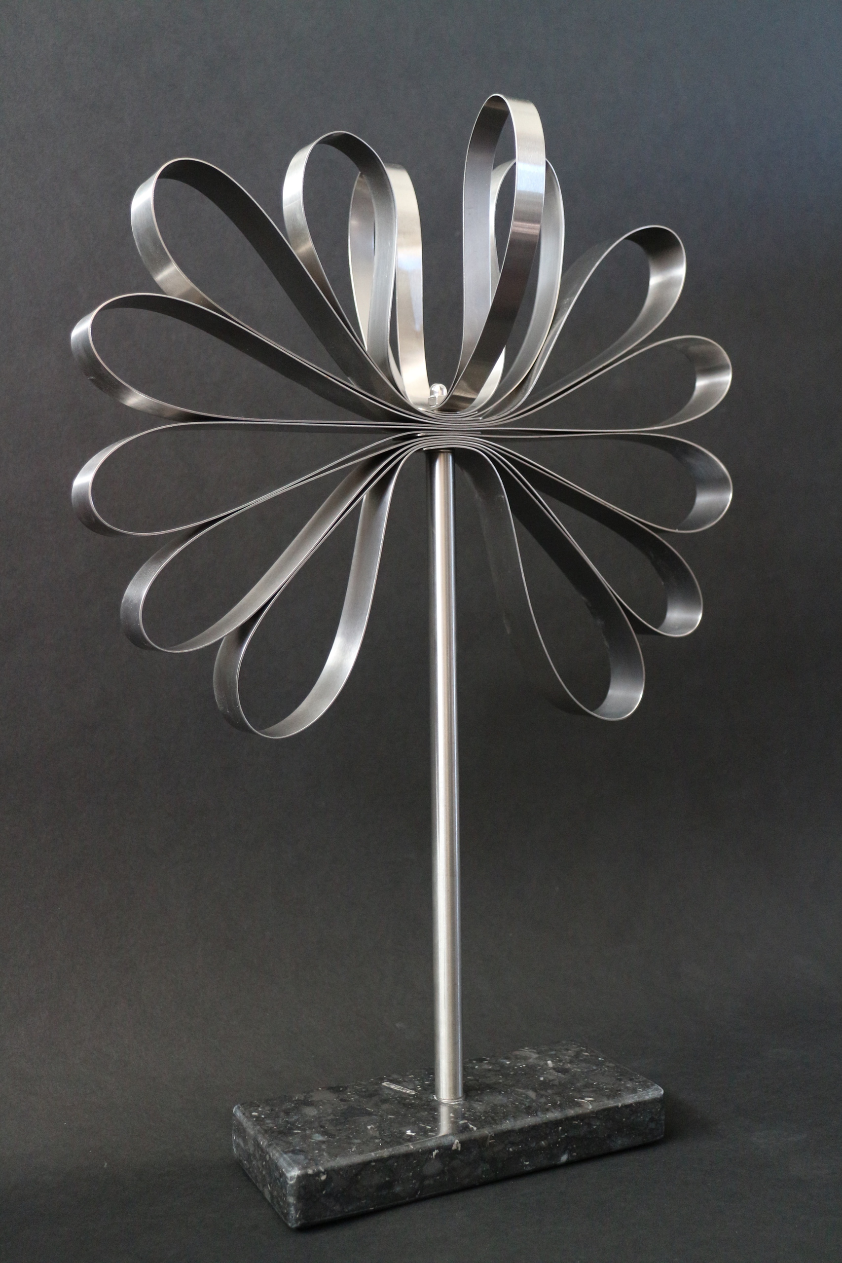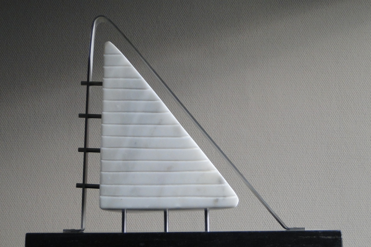 2014-2025Deze sculpturen zijn gemaakt van repen van aluminium of van RVS. In diverse breedten en lengten. De repen zijn gemonteerd aan een RVS stang en geplaatst op een hardstenen sokkel.
