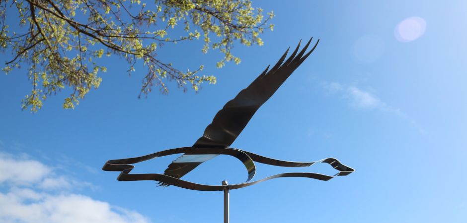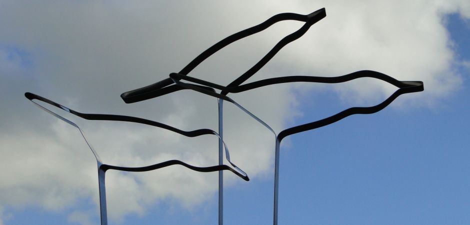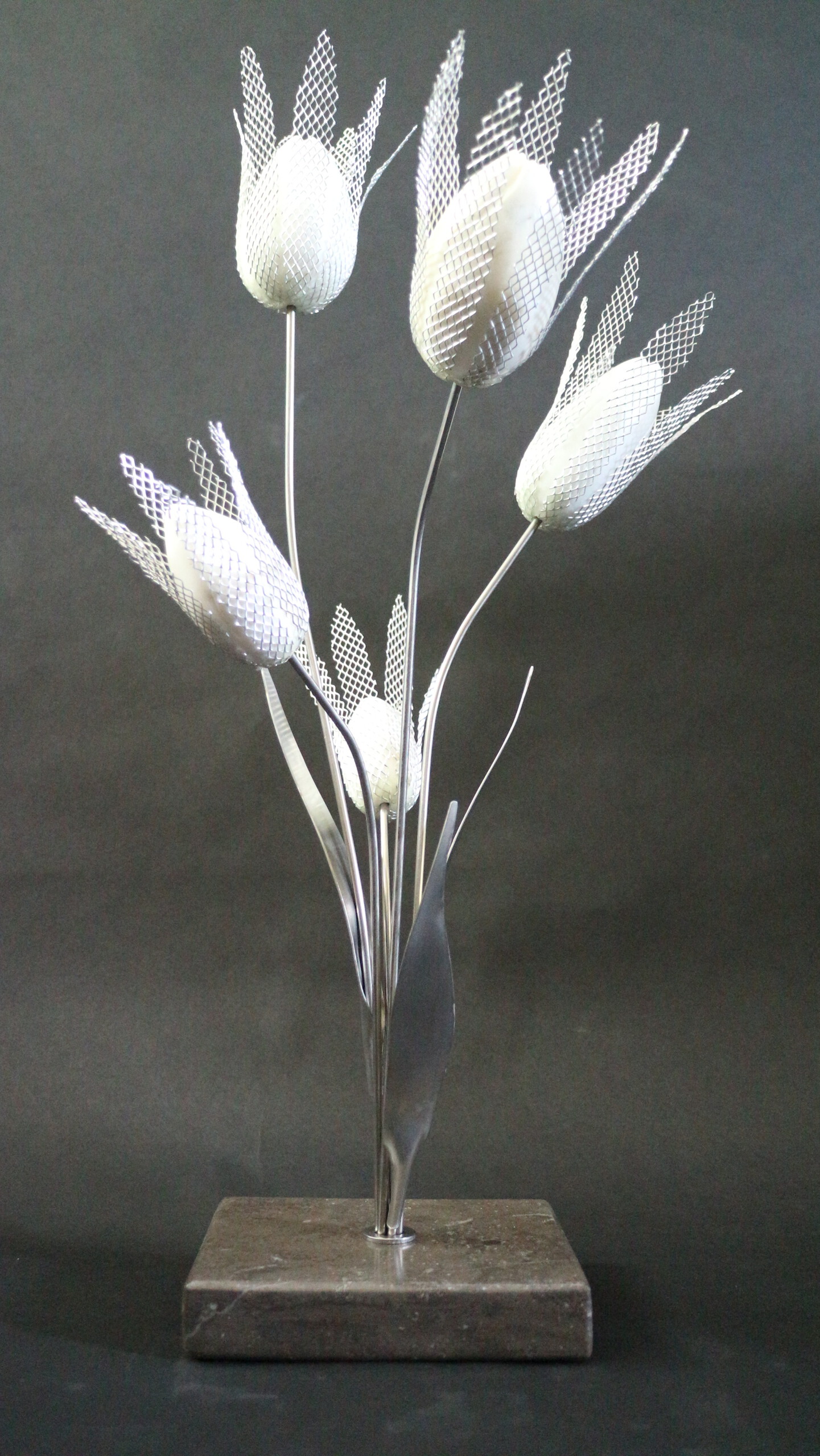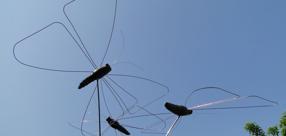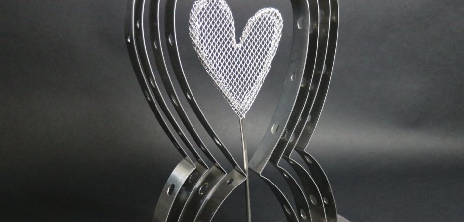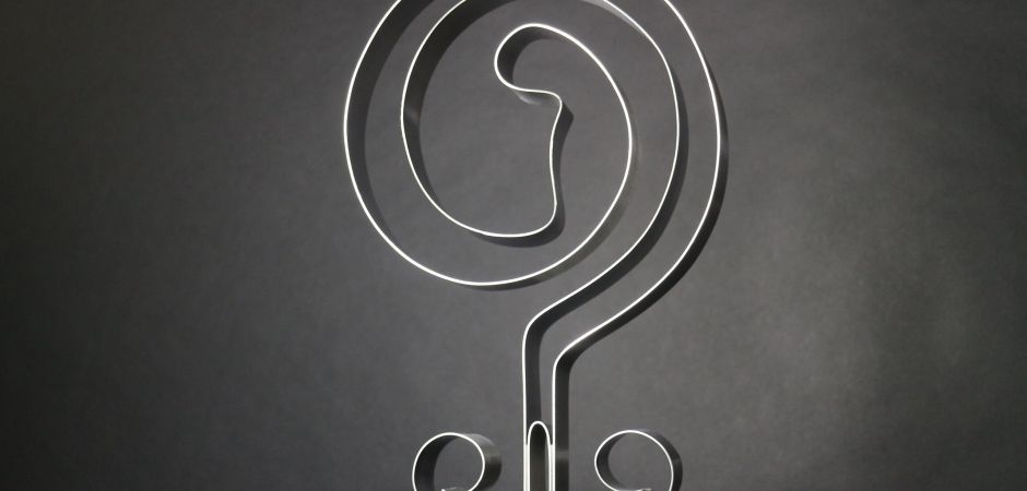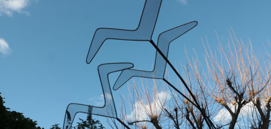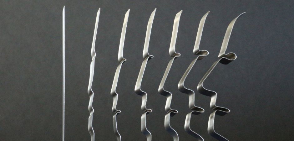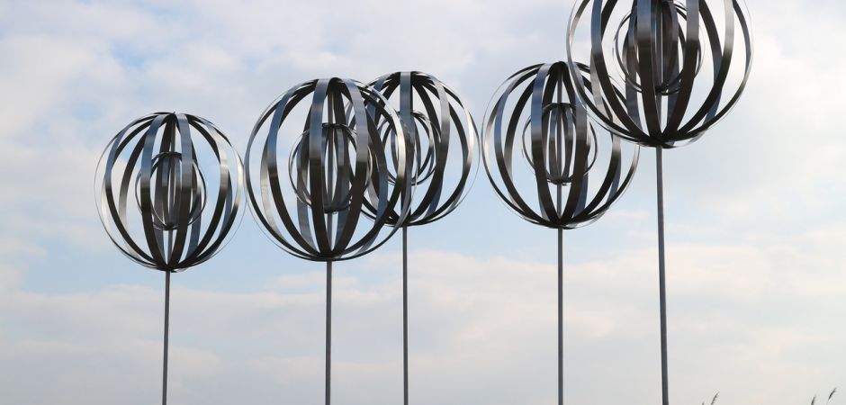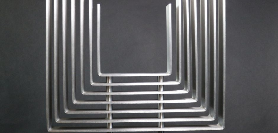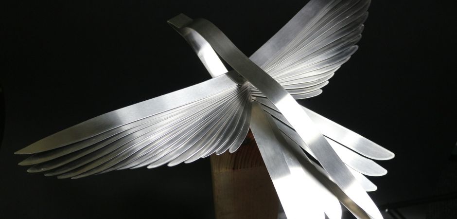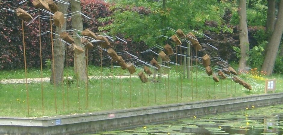 2014-2025Deze sculpturen zijn gemaakt van repen van aluminium of van RVS. In diverse breedten en lengten. De repen zijn gemonteerd aan een RVS stang en geplaatst op een hardstenen sokkel.